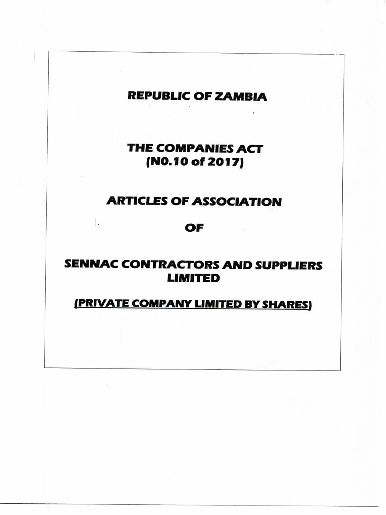 The document outlines the Articles of Association for Sennac Contractors and Suppliers Limited under the Companies Act of Zambia (No. 10 of 2017). It details various regulations regarding share capital, rights of shareholders, procedures for calls on shares, forfeiture of shares, and transfer of shares. Additionally, it covers the roles of directors, general meetings, and the management of company records and dividends.