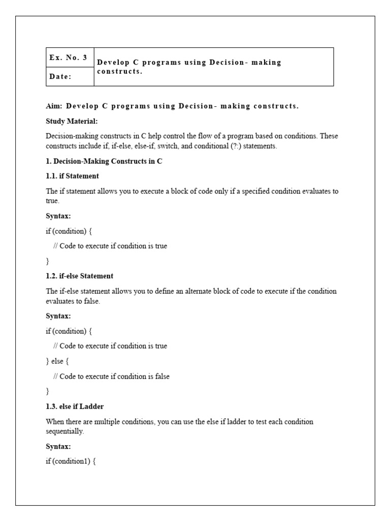 Aim: D e v e l o p C p r o g r a m s u s i n g D e c i s i o n - m a k i n g c o n s t r u c t s .