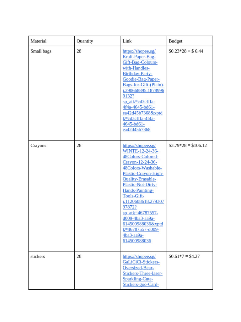 The document lists various materials needed for a project, including small bags, crayons, stickers, pull back cars, and pencils, along with their quantities and budget calculations. The total budget for all items amounts to $159.99. Each item includes a link to purchase from Shopee and specific pricing details.