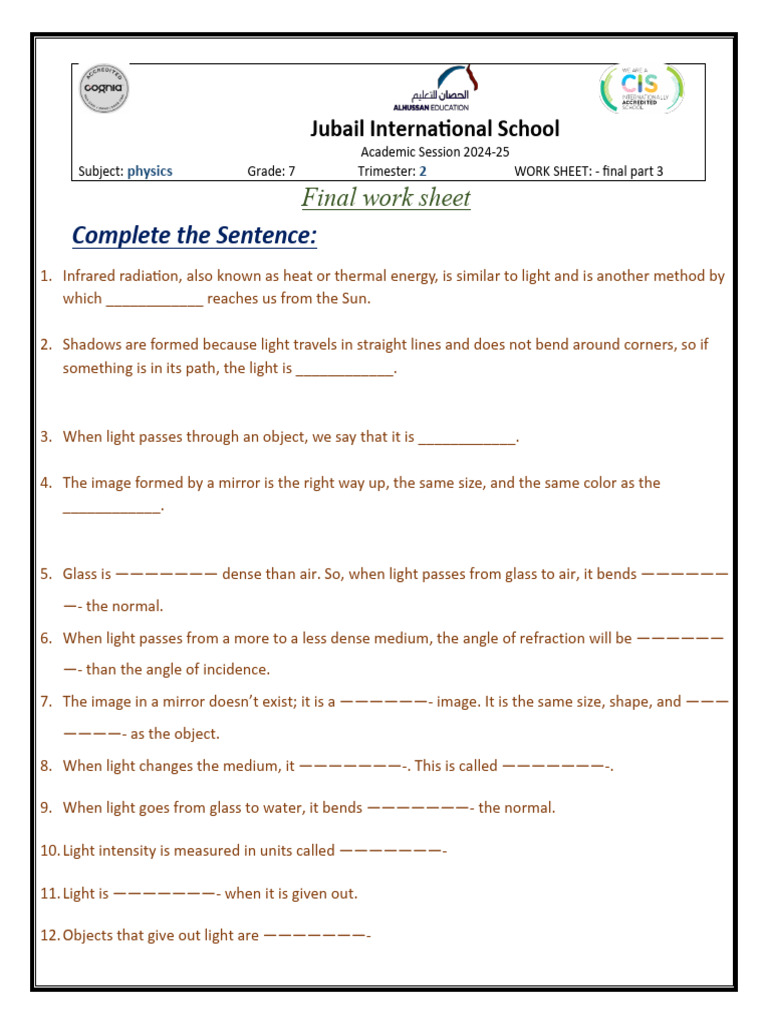 Subject: physics Grade: 7 Trimester: 2 WORK SHEET: - final part 3