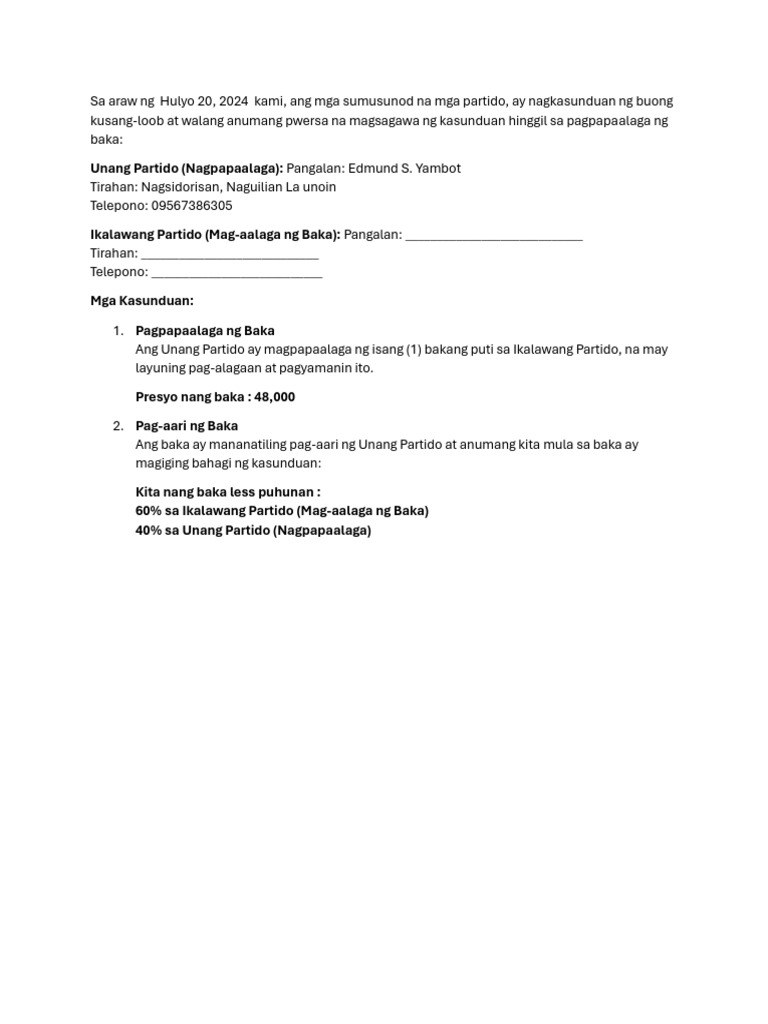 Ang baka ay mananatiling pag-aari ng Unang Partido at anumang kita mula sa baka ay