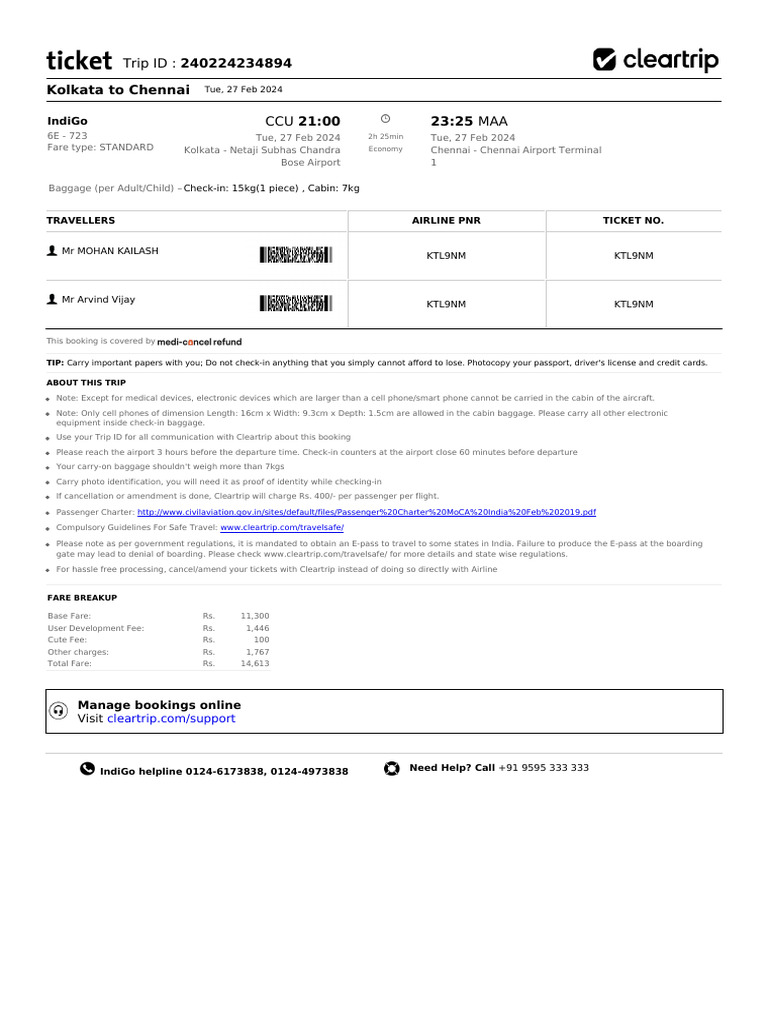 Fare type: STANDARD Kolkata - Netaji Subhas Chandra Economy Chennai - Chennai Airport Terminal