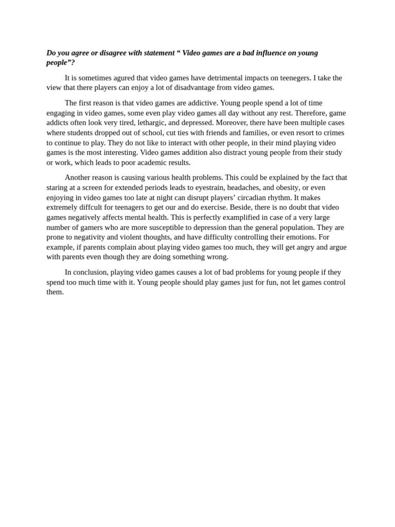 Do you agree or disagree with statement “ Video games are a bad influence on young
