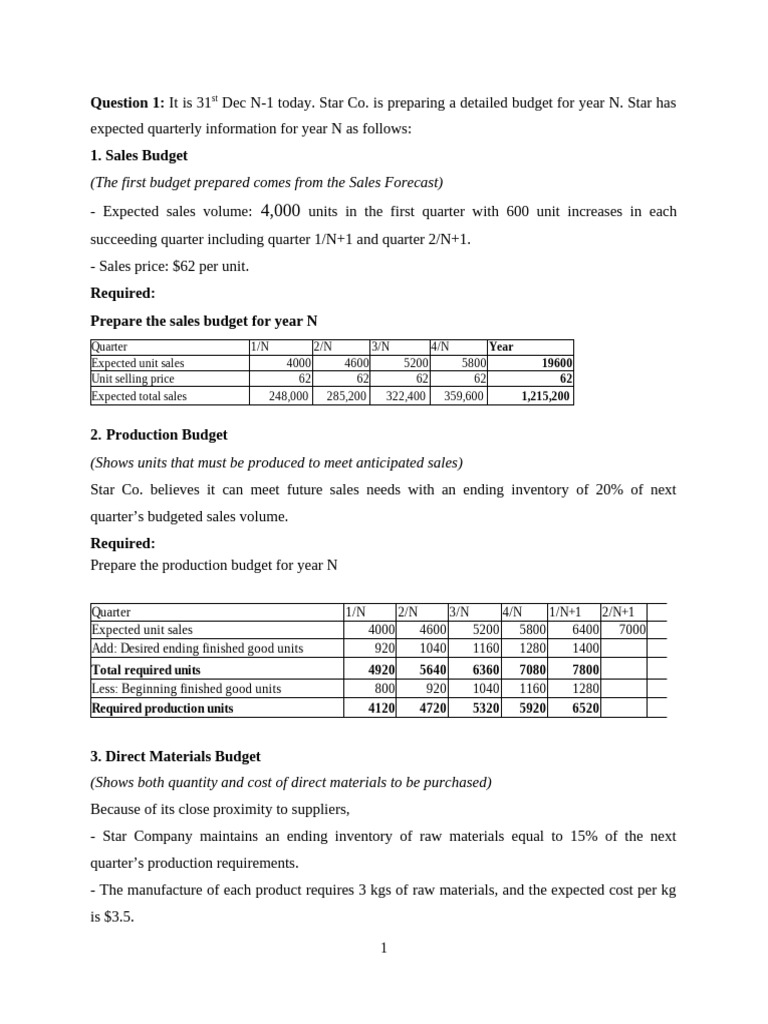 Question 1: It is 31st Dec N-1 today. Star Co. is preparing a detailed budget for year N.