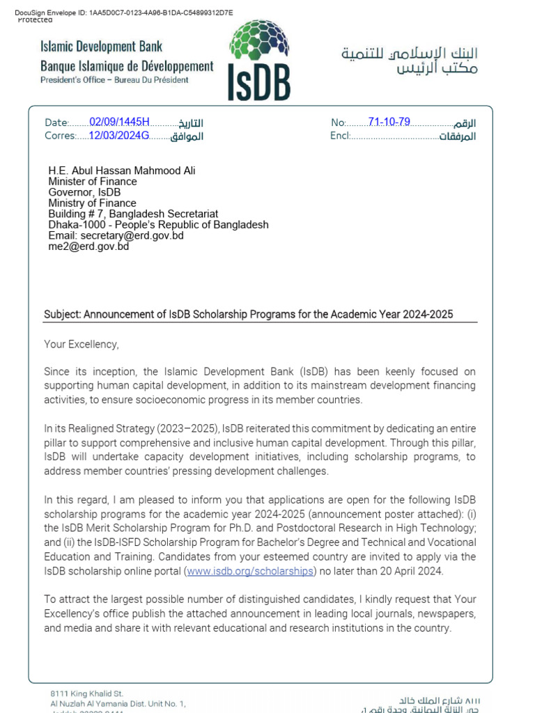 IsDB scholarship online portal (www.isdb.org/scholarships) no later than 20 April 2024.