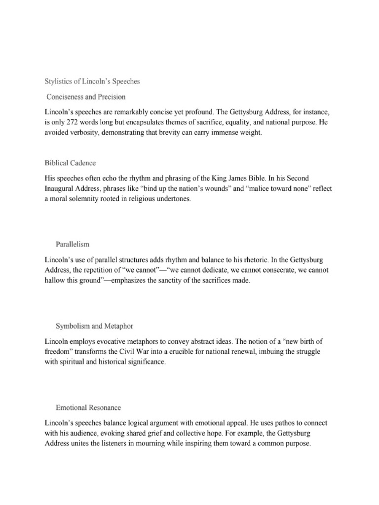 Lincoln’s speeches balance logical argument with emotional appeal. He uses pathos to connect