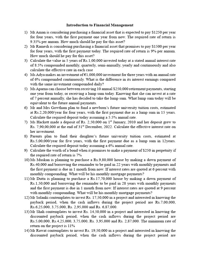 1) Mr Aman is considering purchasing a financial asset that is expected to pay $1250 per year