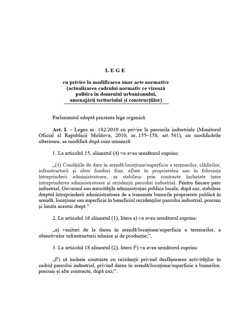 Art. I. – Legea nr. 182/2010 cu privire la parcurile industriale (Monitorul