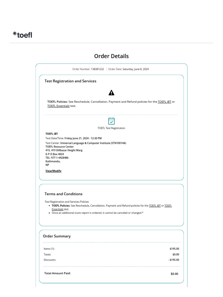 TOEFL Policies: See Reschedule, Cancellation, Payment and Refund policies for the TOEFL iBT or