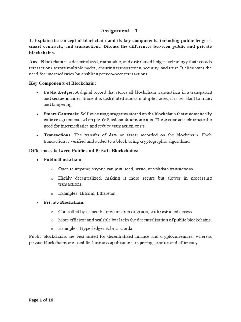 1. Explain the concept of blockchain and its key components, including public ledgers,