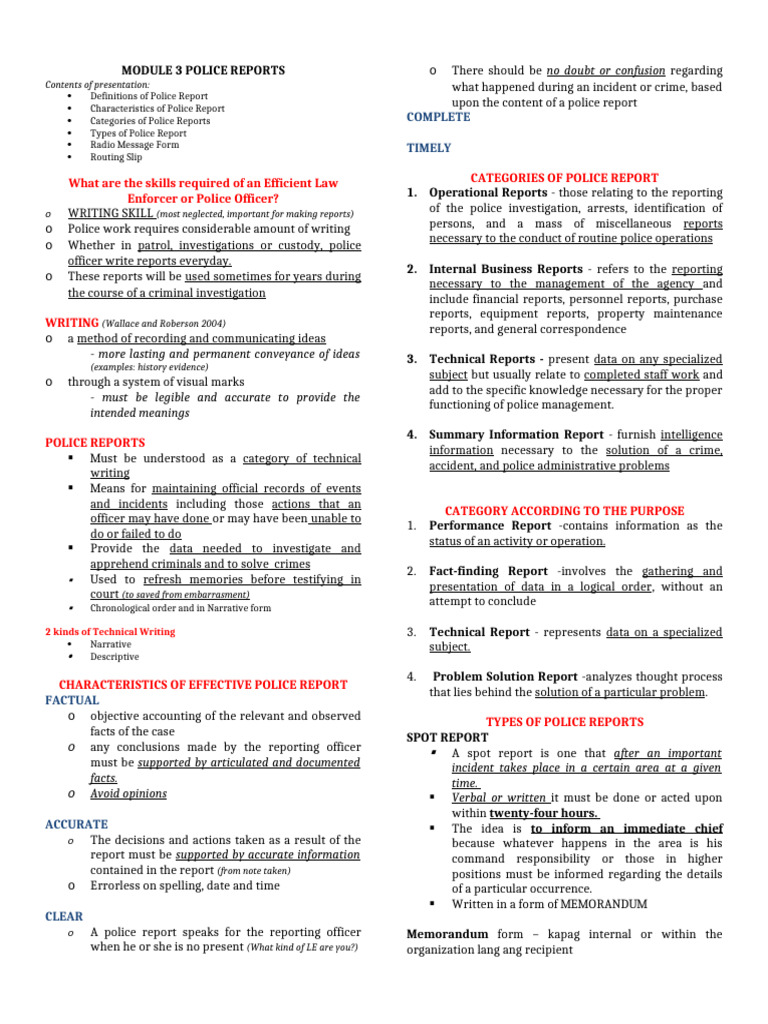 MODULE 3 POLICE REPORTS oThere should be no doubt or confusion regarding