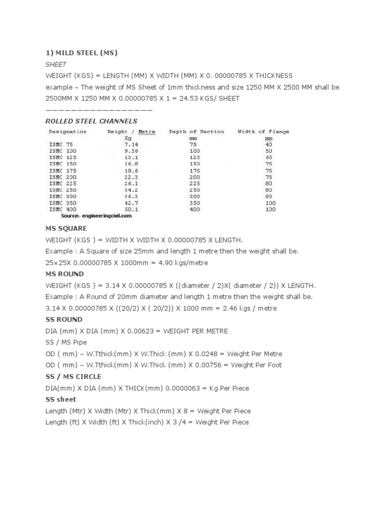 example The weight of MS Sheet of 1mm thickness and size 1250 MM X 2500 MM shall be
