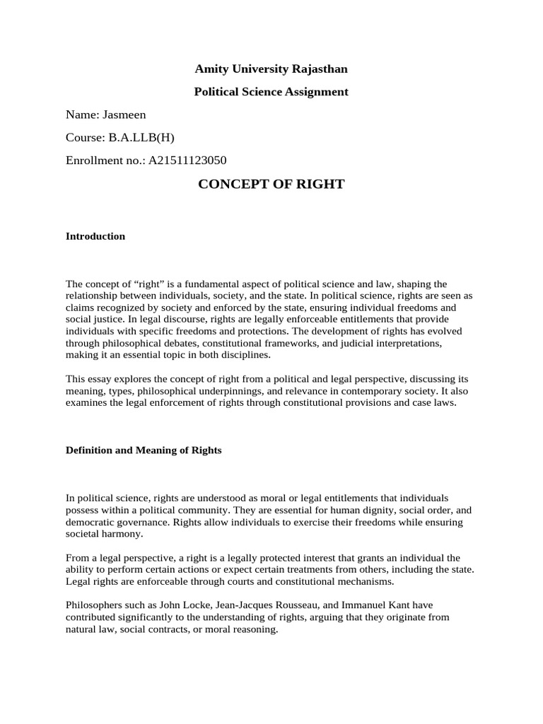 This essay explores the concept of right from a political and legal perspective, discussing its