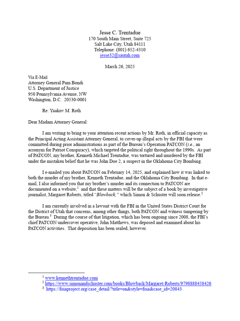 both the murder of my brother, Kenneth Trentadue, and the Oklahoma City Bombing. In that e-