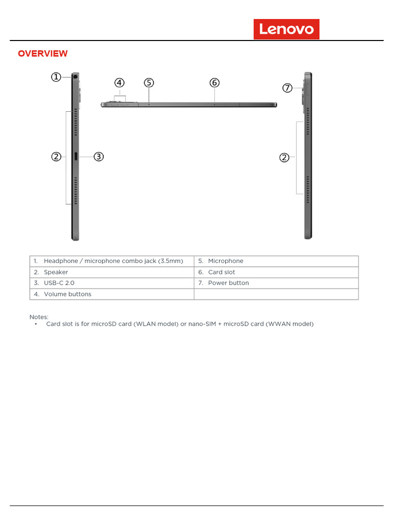 • Card slot is for microSD card (WLAN model) or nano-SIM + microSD card (WWAN model)