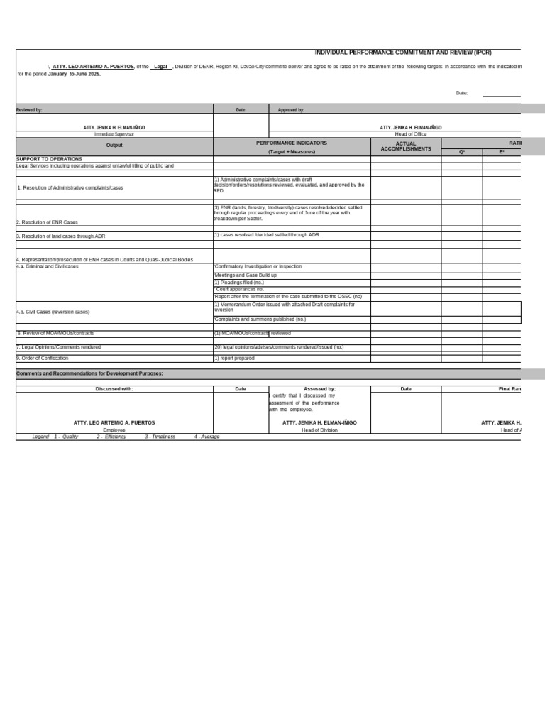 I, ATTY. LEO ARTEMIO A. PUERTOS, of the Legal , Division of DENR, Region XI, Davao City commit to deliver and agree to be rated on the attainment of the following targets in accordance with the indicated measures