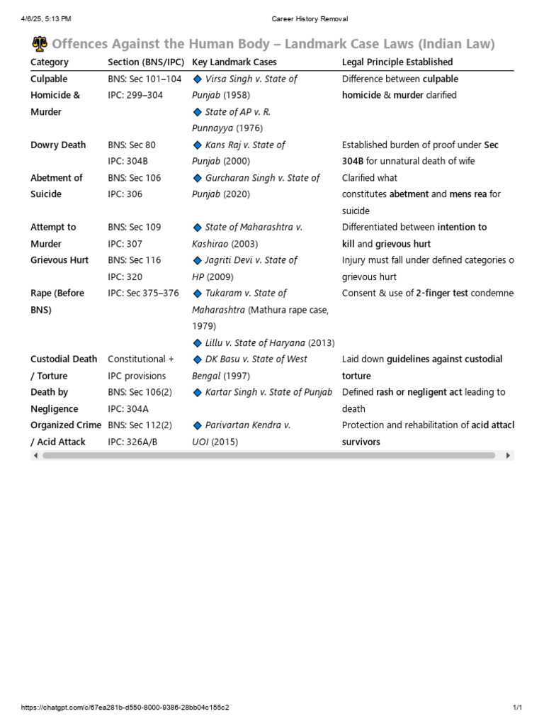 Category Section (BNS/IPC) Key Landmark Cases Legal Principle Established