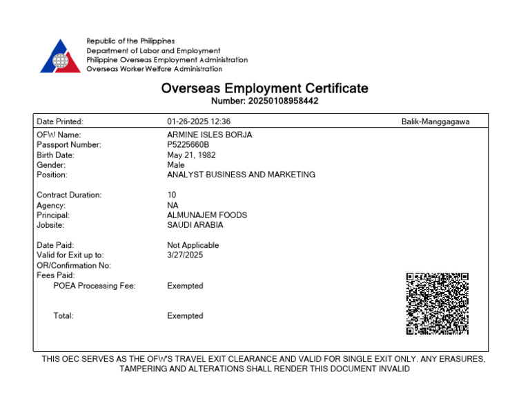 THIS OEC SERVES AS THE OFW'S TRAVEL EXIT CLEARANCE AND VALID FOR SINGLE EXIT ONLY. ANY ERASURES,