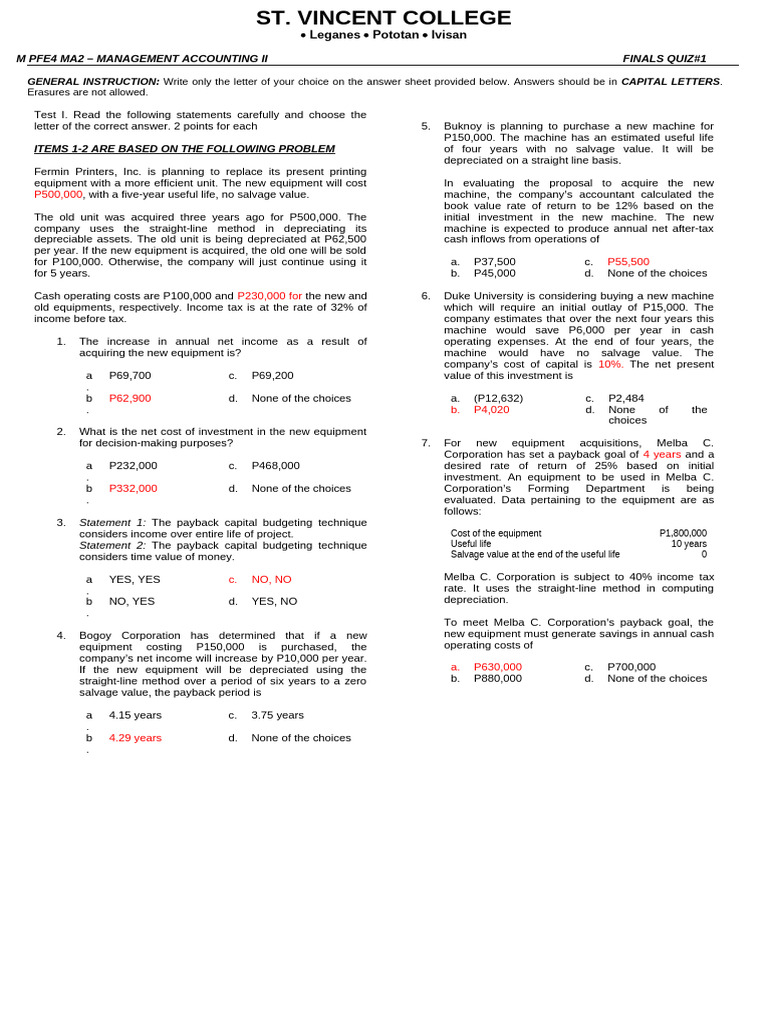 letter of the correct answer. 2 points for each 5. Buknoy is planning to purchase a new machine for
