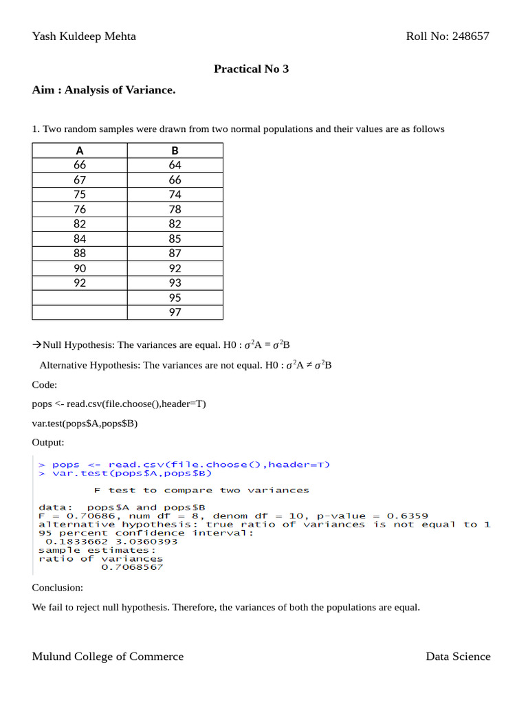 Aim : Analysis of Variance.