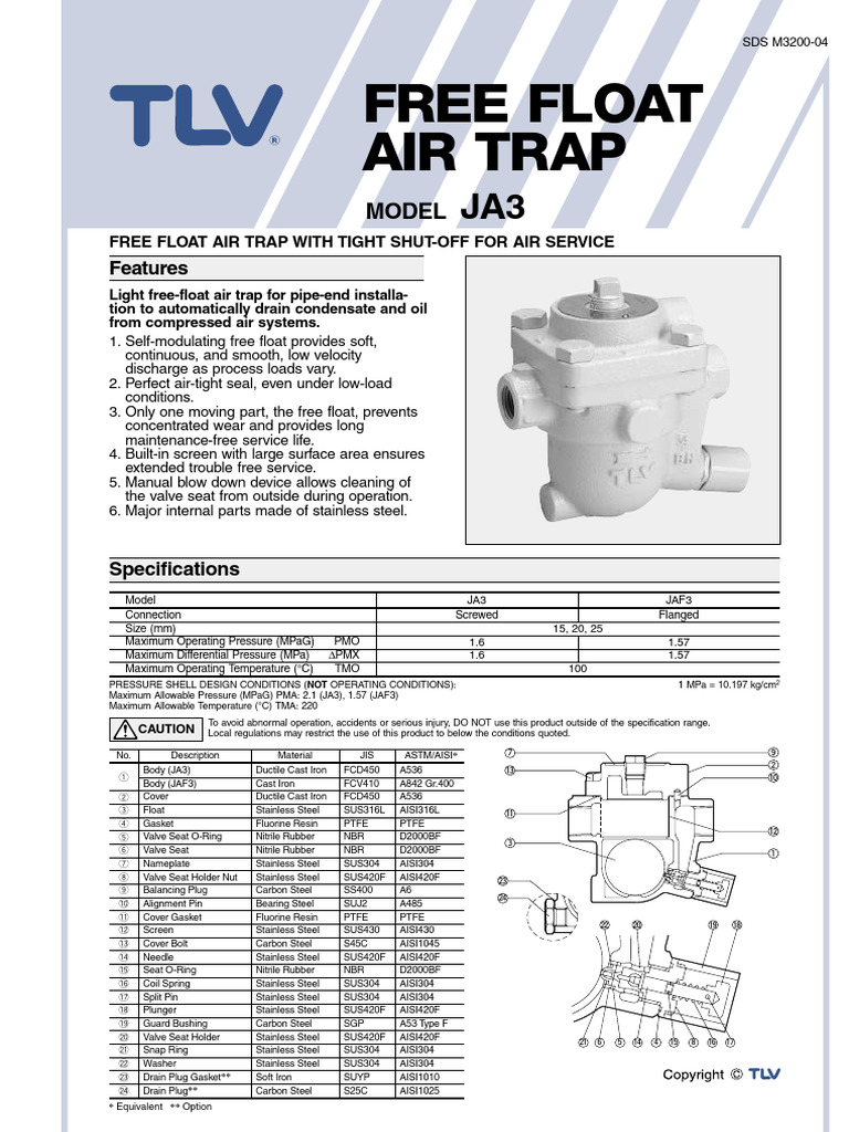 Maximum Allowable Pressure (MPaG) PMA: 2.1 (JA3), 1.57 (JAF3)