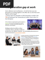 The project starts with a brief introduction of the 3 generations in workforce and major difference among them. It than tells various challenges that an employee and organization have to face because of different generations. It ends with recommendations to solve the conflicts.