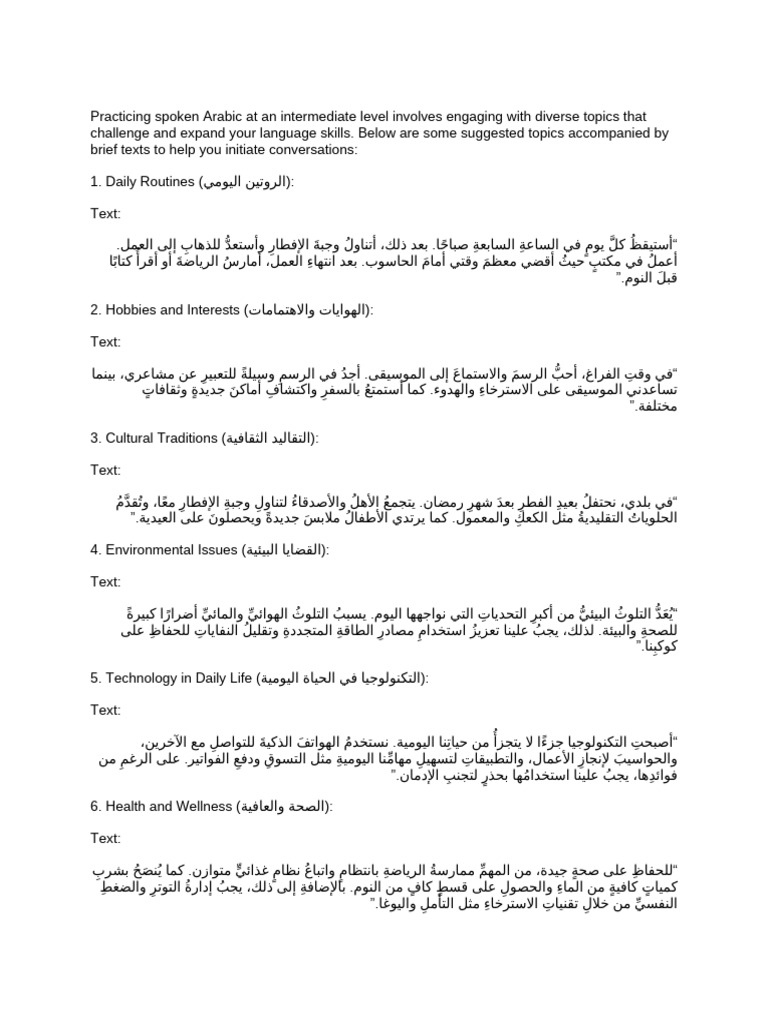 Practicing spoken Arabic at an intermediate level involves engaging with diverse topics that