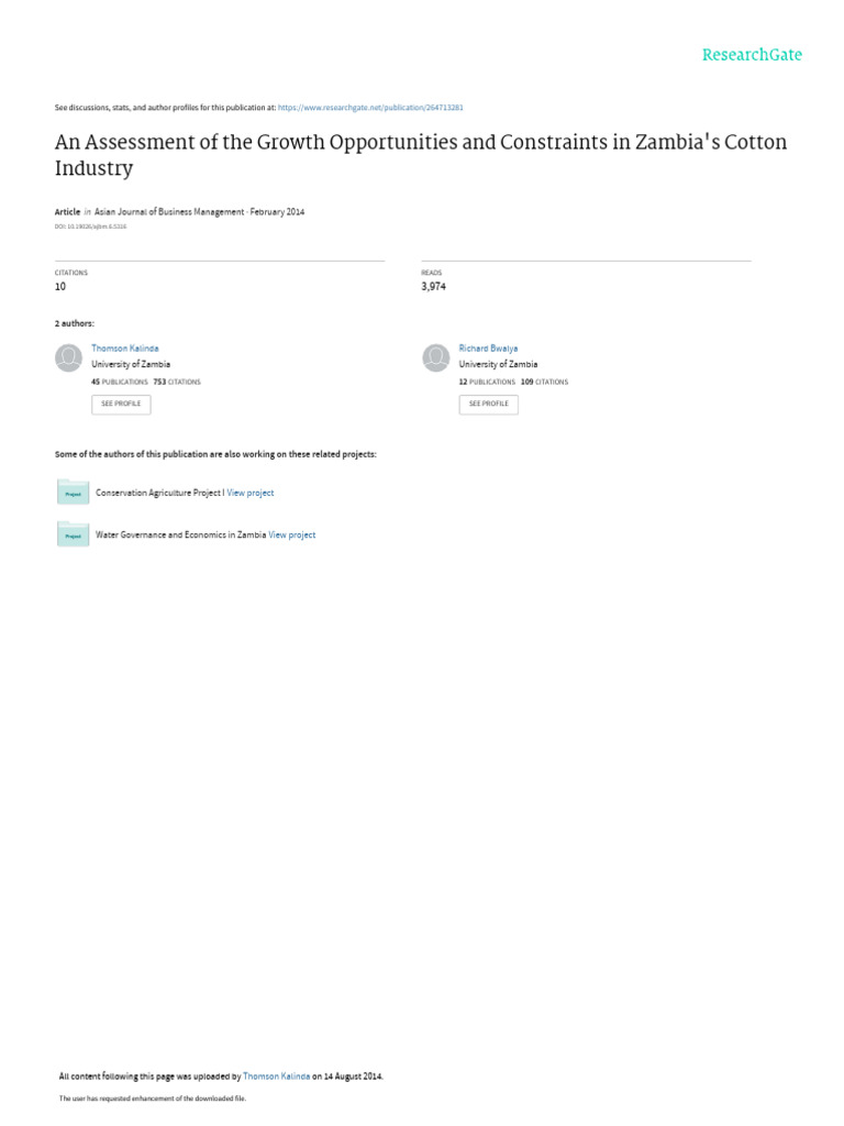 Abstract: The main objective of this study was to assess the major opportunities and constraints in Zambia’s cotton