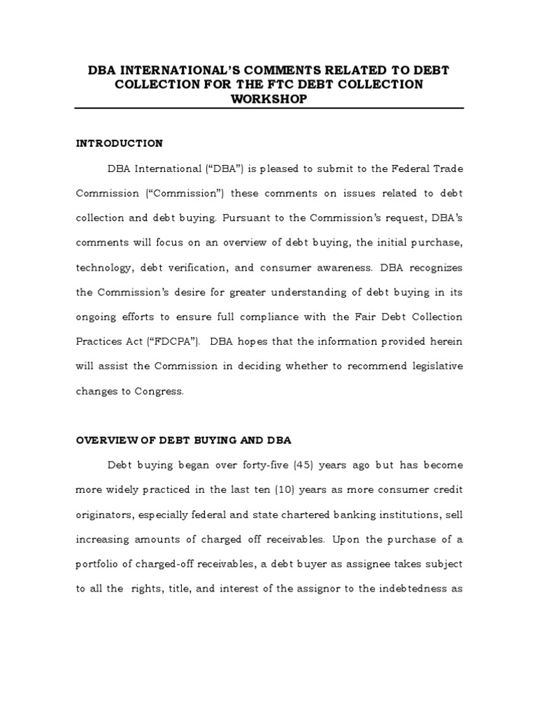 DBA International (“DBA”) is pleased to submit to the Federal Trade Commission (“Commission”) these comments on issues related to debt collection and debt buying. Pursuant to the Commission’s request, DBA’s comments will focus on an overview of debt buying, the initial purchase, technology, debt verification, and consumer awareness. DBA recognizes the Commission’s desire for greater understanding of debt buying in its ongoing efforts to ensure full compliance with the Fair Debt Collection Practices Act (“FDCPA”). DBA hopes that the information provided herein will assist the Commission in deciding whether to recommend legislative changes to Congress.