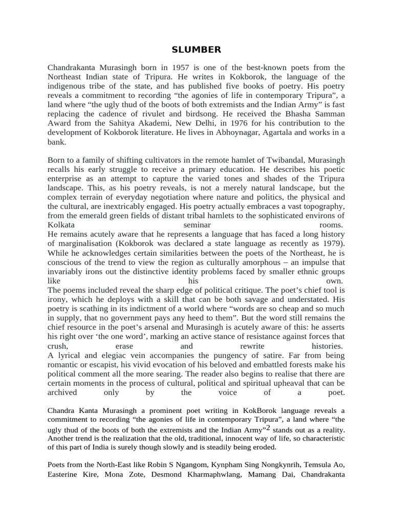 search for peace and harmony. For instance, “Chandra kanta Murasingh, a poet from Tripura