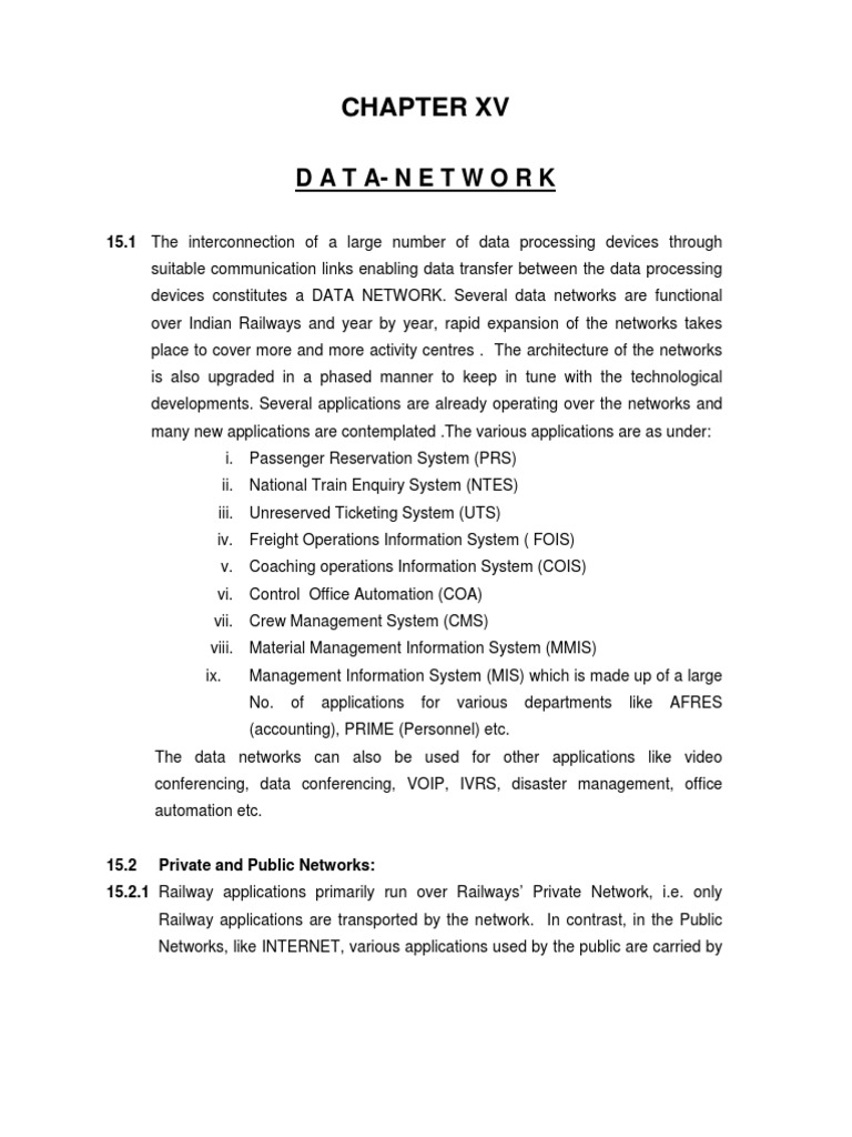 15.1 The interconnection of a large number of data processing devices through suitable communication links enabling data transfer between the data processing devices constitutes a DATA NETWORK. Several data networks are functional over Indian Railways and year by year, rapid expansion of the networks takes place to cover more and more activity centres . The architecture of the networks is also upgraded in a phased manner to keep in tune with the technological developments. Several applications are already operating over the networks and many new applications are contemplated .The various applications are as under: i. ii. iii. iv. v. vi. vii. viii. ix. Passenger Reservation System (PRS) National Train Enquiry System (NTES) Unreserved Ticketing System (UTS) Freight Operations Information System ( FOIS) Coaching operations Information System (COIS) Control Office Automation (COA) Crew Management System (CMS) Material Management Information System (MMIS) Management Information System (MIS) which is made up of a large No. of applications for various departments like AFRES (accounting), PRIME (Personnel) etc. The data networks can also be used for other applications like video conferencing, data conferencing, VOIP, IVRS, disaster management, office automation etc. 15.2 Private and Public Networks: Railway applications are transported by the network. In contrast, in the Public Networks, like INTERNET, various applications used by the public are carried by