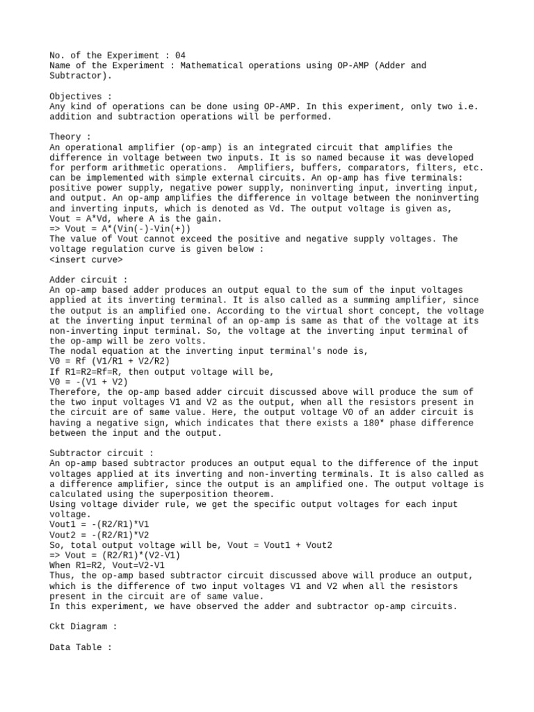In this experiment, we have observed the adder and subtractor op-amp circuits.
