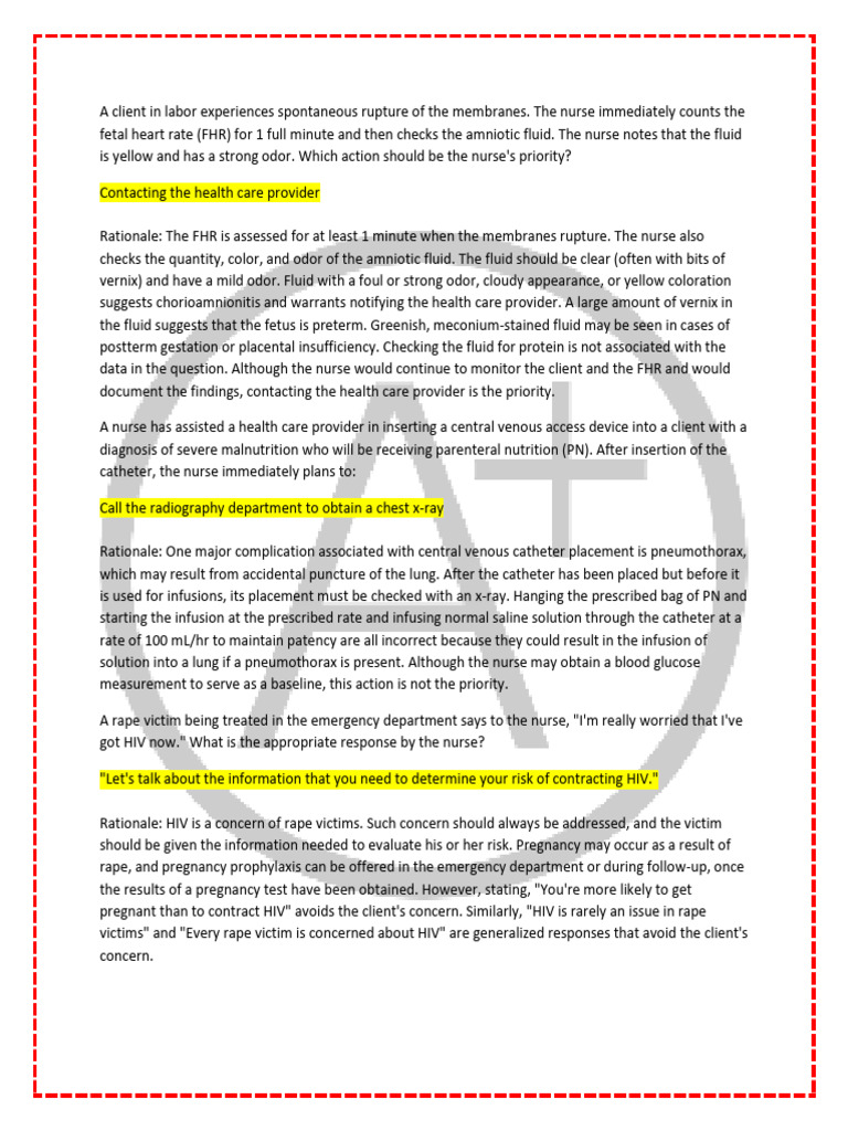 Rationale: The FHR is assessed for at least 1 minute when the membranes rupture. The nurse also