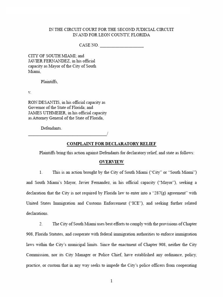 and South Miami’s Mayor, Javier Fernandez, in his official capacity (“Mayor”), seeking a