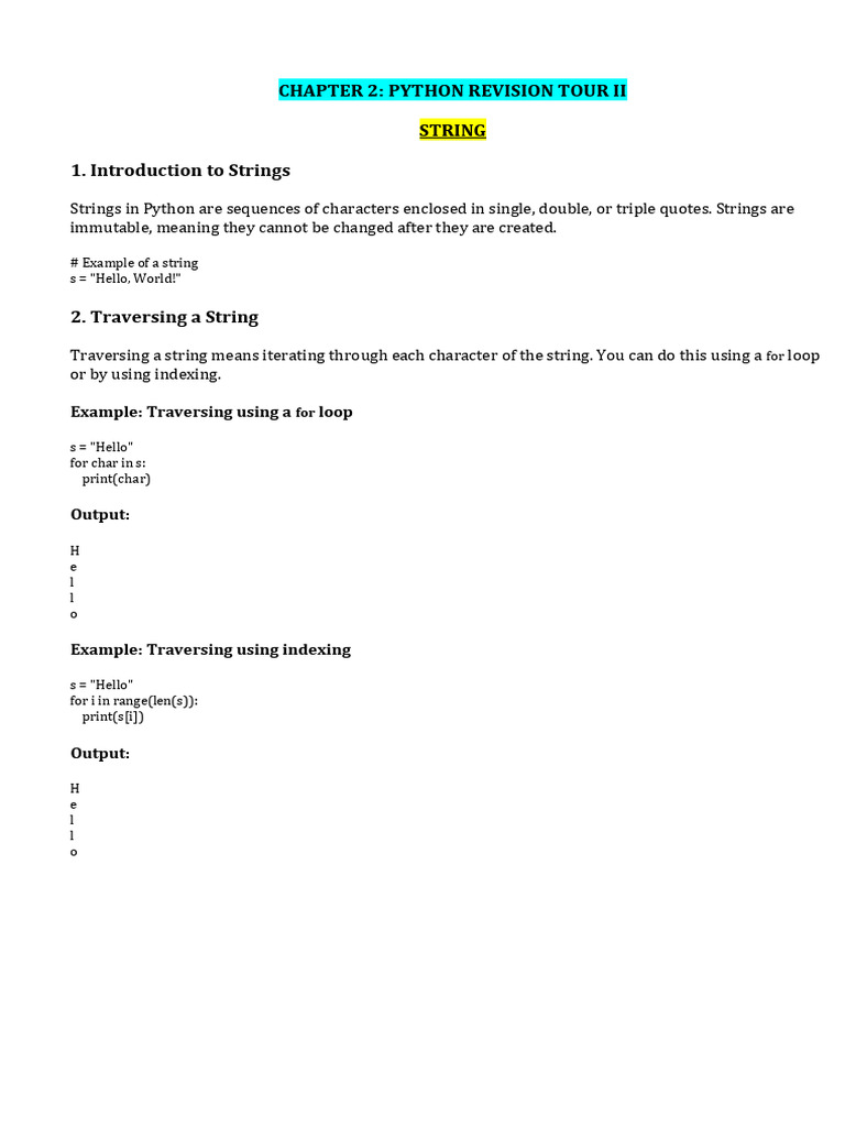 Traversing a string means iterating through each character of the string. You can do this using a for loop