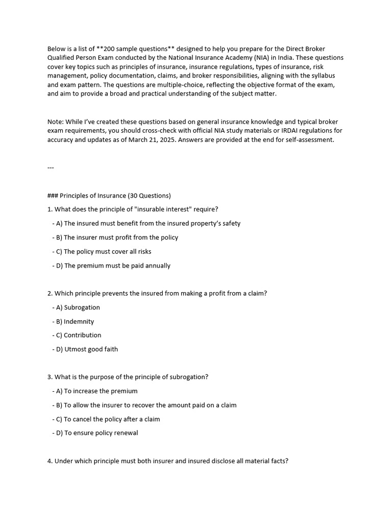 Qualified Person Exam conducted by the National Insurance Academy (NIA) in India. These questions