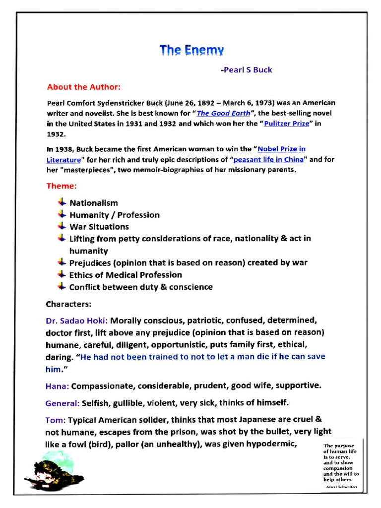 1) In the story 'The Enemy', what is the main dilemma that Hana and Sadao