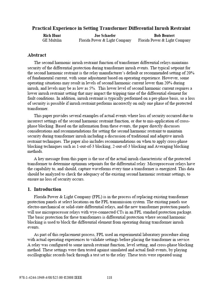 criteria was determined. These settings are then confirmed by capturing transformer in-rush