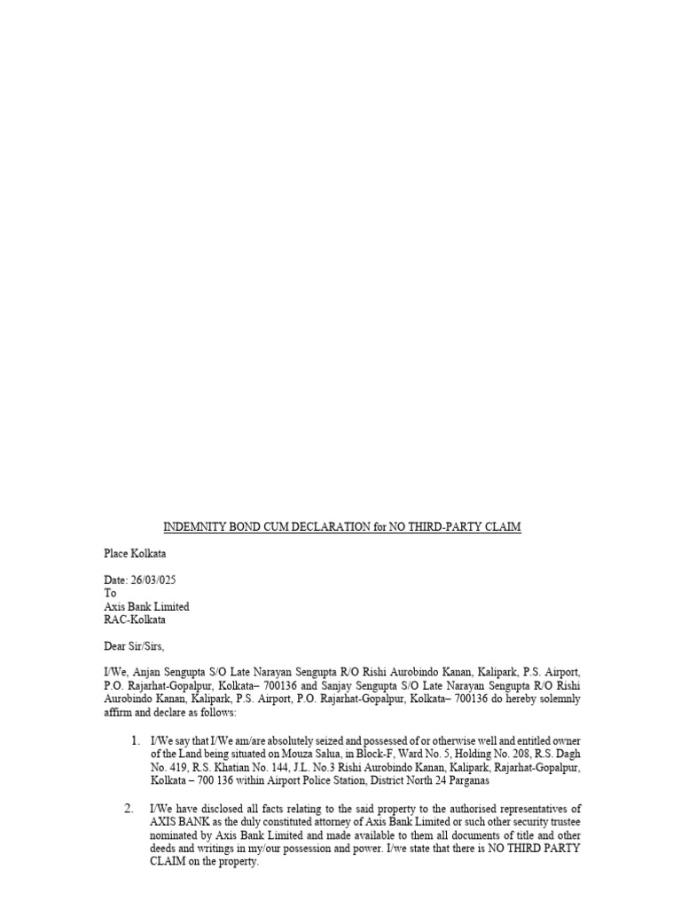 INDEMNITY BOND CUM DECLARATION for NO THIRD-PARTY CLAIM