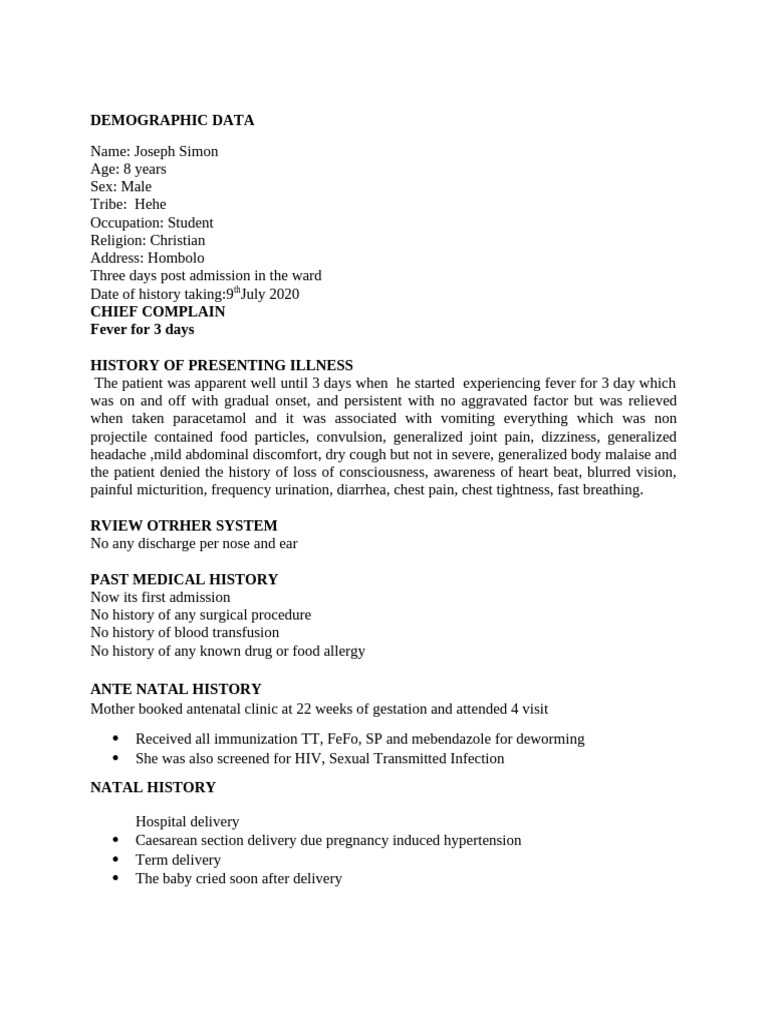 A 8 years old boy from Hombolo who come with a complain of fever for 3 days which was