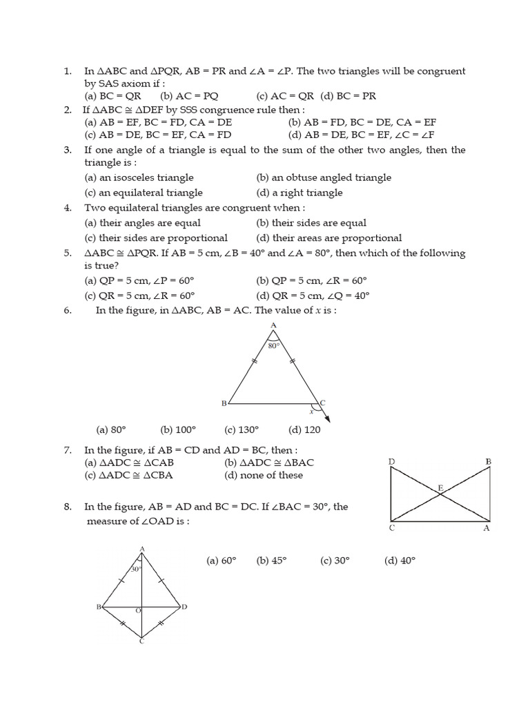 (c) AB = DE, BC = EF, CA = FD (d) AB = DE, BC = EF, ∠C = ∠F