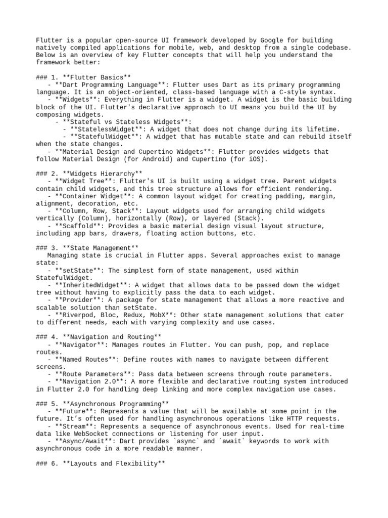 Below is an overview of key Flutter concepts that will help you understand the