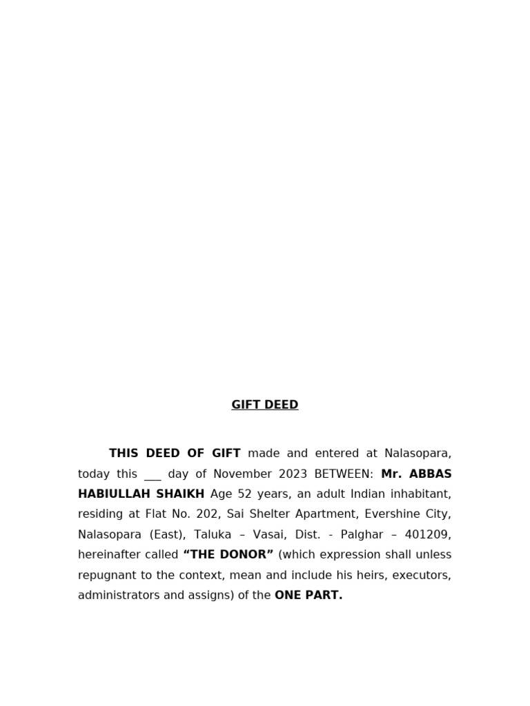 THIS DEED OF GIFT made and entered at Nalasopara,