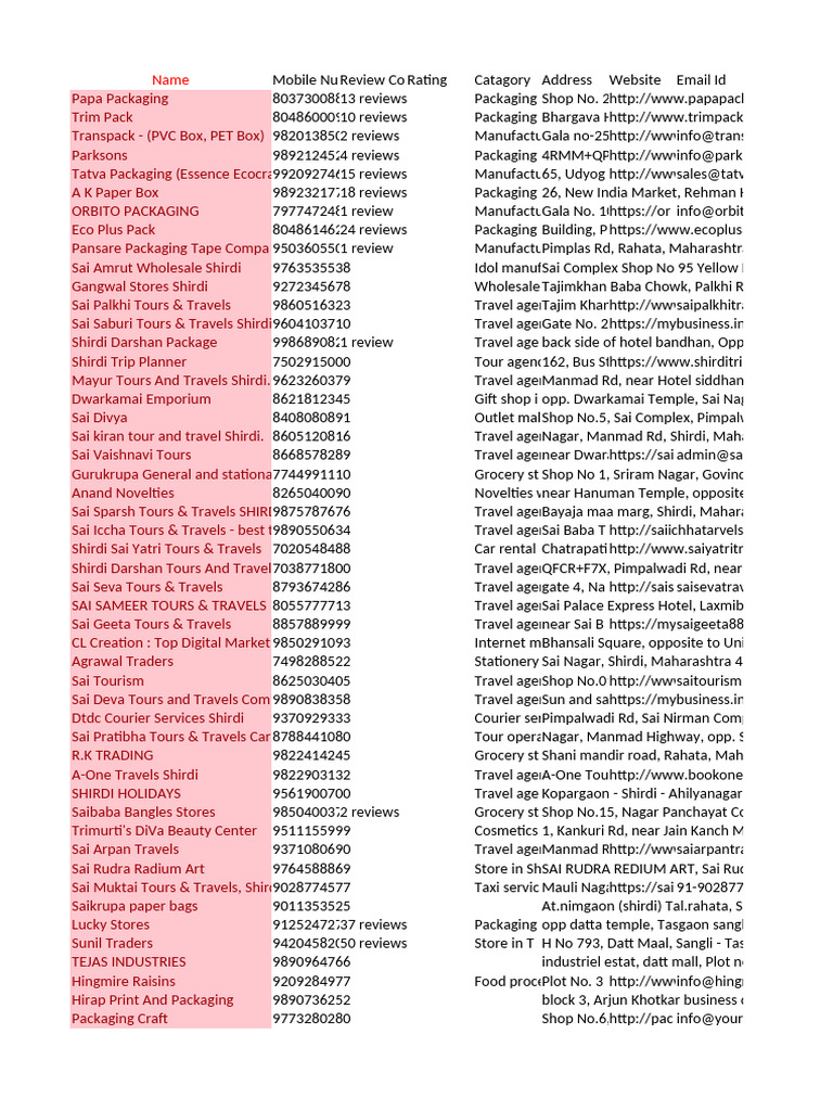 Name Mobile Nu Review Co Rating Catagory Address Website Email Id