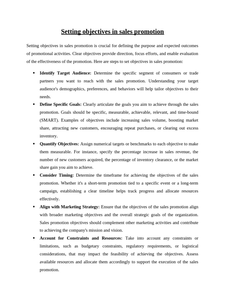 of the effectiveness of the promotion. Here are steps to set objectives in sales promotion: