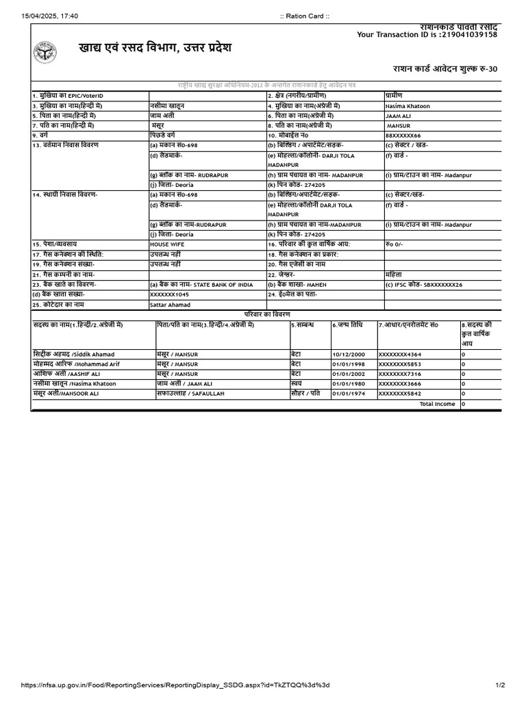 15. पेशा/व्यवसाय HOUSE WIFE 16. परिवार की कु ल वार्षिक आय: रुo 0/-