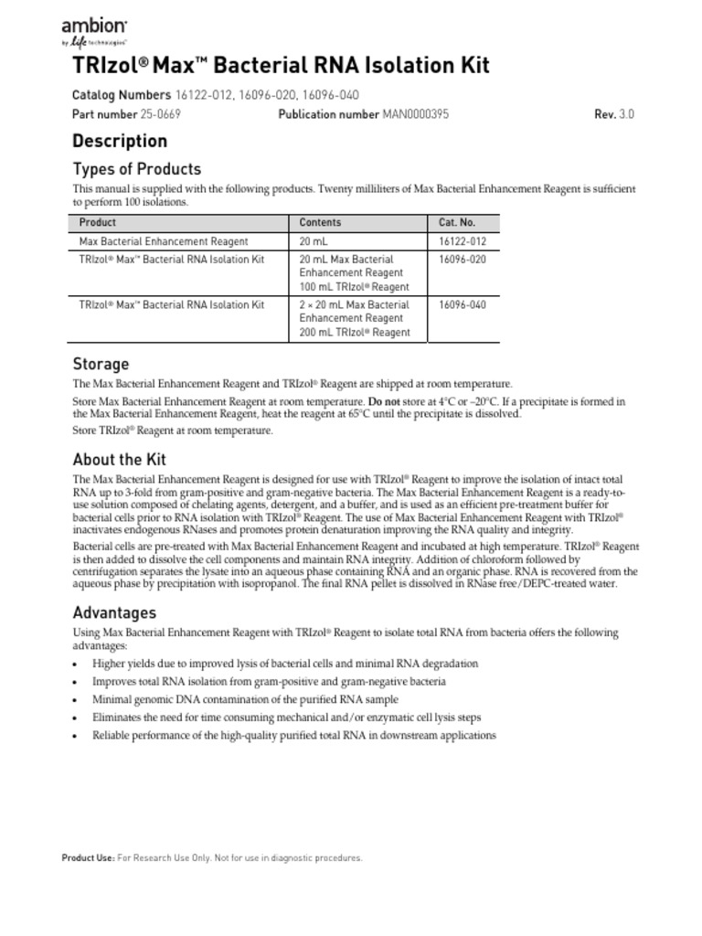Product Qualification and SDS TRIzol® Max™ Bacterial RNA Isolation Kit