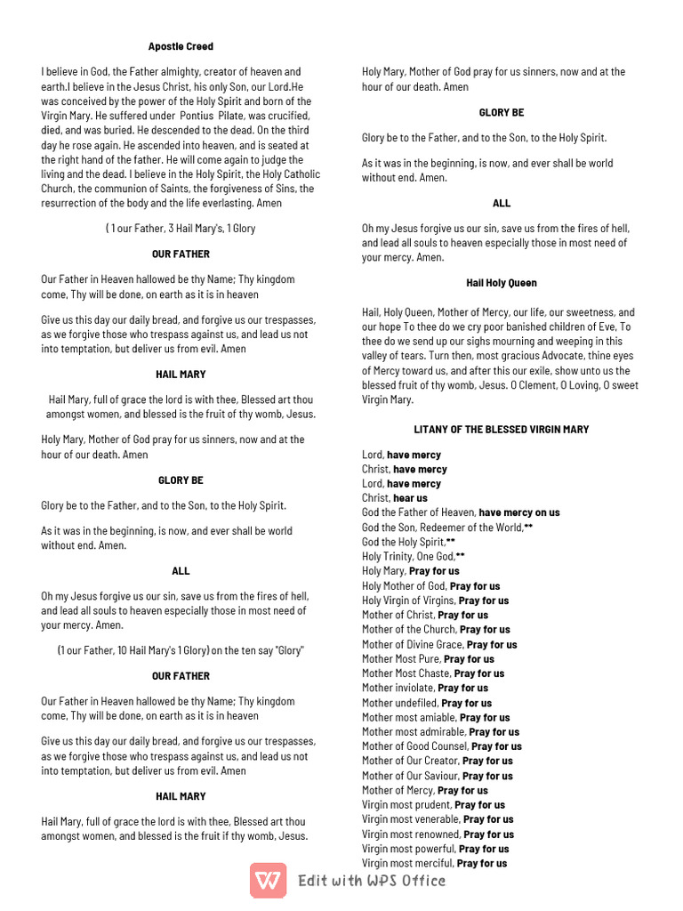 earth.I believe in the Jesus Christ, his only Son, our Lord.He hour of our death. Amen