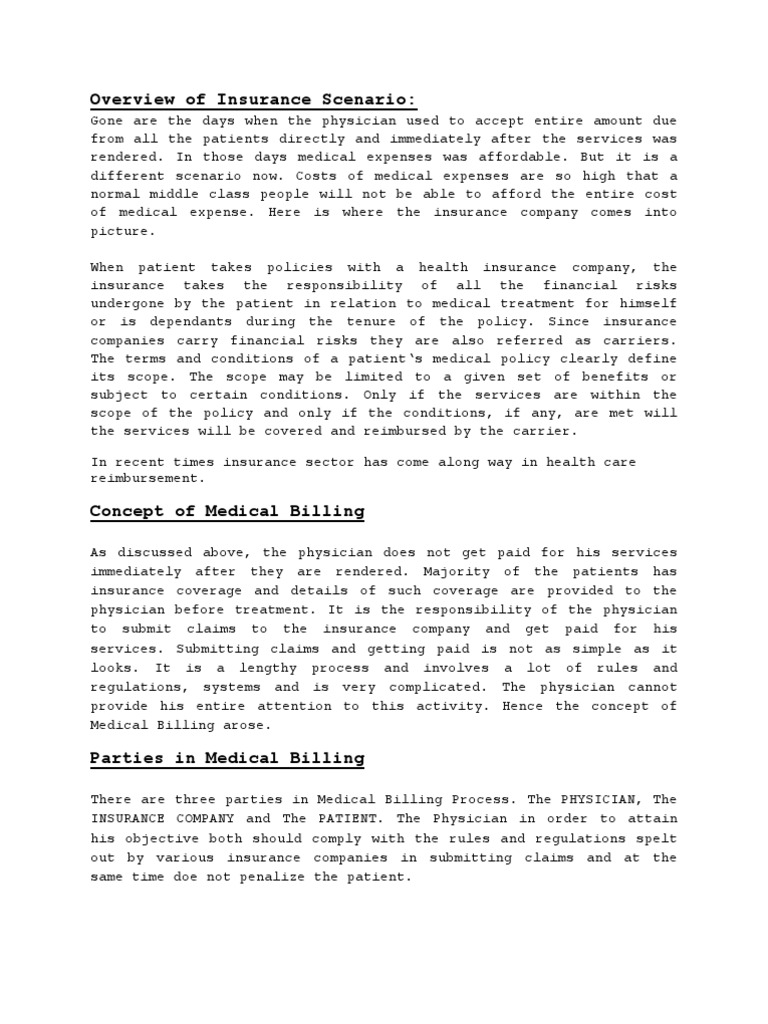 care practice a better and more consistent cash flow, which can reduce stress and frustration and improve profitability. Before being able to understanding how to bill and file an insurance claim, you must understand what health insurance is? It is imperative that the medical biller understands the various types of insurance and that each insurance company has its own rules, regulations, and policy guidelines they are governed by. A medical biller will need to understand the physicians responsibilities and obligations to the patients, as well as any agreements the physician has with the insurance companies regarding, adjustments, charges and coding basics. Without this basic knowledge, a medical biller will find it difficult to combat the common problems of claims submission.