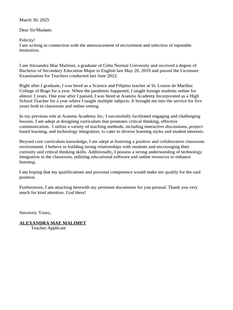 I am Alexandra Mae Malimet, a graduate of Cebu Normal University and received a degree of